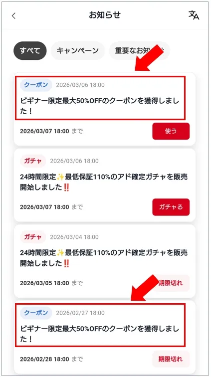 cloveオリパでは、毎週金曜日の18時にビギナー限定最大50%OFFのクーポンコードを配布しています。入手場所はマイページの「お知らせ」です。