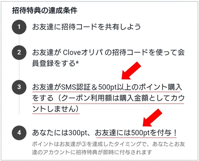 cloveオリパでは新規登録時に招待コードを入力して、SMS認証と500pt以上のポイントを購入すると、無料で500ptが付与されます。