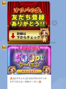 オリパの虎では、LINEを友だち追加するだけで500コインを無料で獲得できます。無料コインだけでオリパを回せるので、始め得です。
